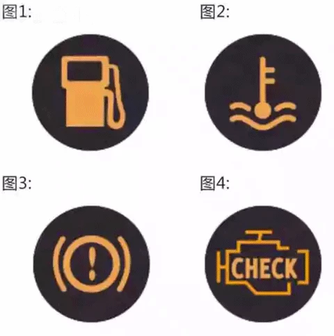 图1是油量指示灯,图2是水温指示灯,图3是手刹指示灯,图4是发动机指示灯。
