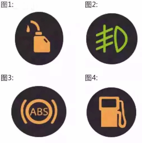 图1是机油指示灯,图2是前雾灯指示灯,图3是ABS指示灯,图4是油量指示灯。