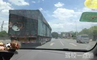 如图所示,驾驶车辆在路口导向车道线处遇到大型货车不按道行驶时,机动车驾驶人可以鸣喇叭示意,并从大货车右侧超越,逼其驶回原车道。