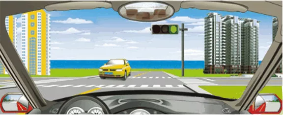 在路口直行看到图中这种情况,要在停止线以外停车等待对面直行车通过后再起步。