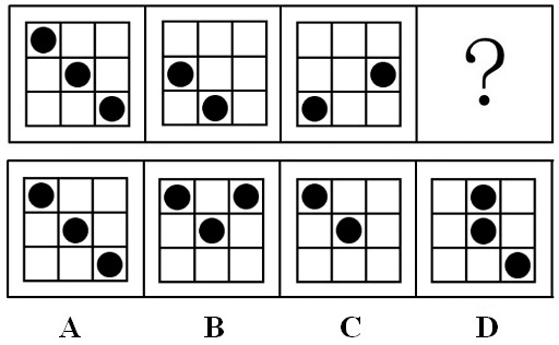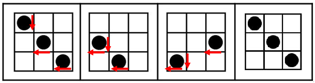 【解析】本题考查位置类。 题干图形中三个黑点的运动规律如下图所示,左上角黑点每次向下移动一格,余下两个黑点每次向左移动一格。