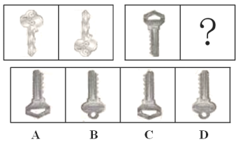 【解析】本题考查位置类。 观察题干,可得:图形组成相同,考虑位置类。在第一组图形中,将第一个图形沿横轴翻转得到第二个图形。第二组图形遵循相同的规律,“?”处图形应该由第一个图形沿横轴翻转得到。 故本题答案为C选项。