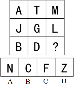 【解析】本题考查属性类。 观察发现,九宫格第一行都是竖轴对称图形,第二行都是不对称图形,第三行前两个为横轴对称图形,因此“?”处图形应为横轴对称图形。 故本题答案为B选项。