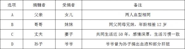 C项,按照正常的伦理关系,丈夫和妻子之间无血缘关系,骨髓移植成功的概率为几十万分之一,接近于0。不符合题意,排除。