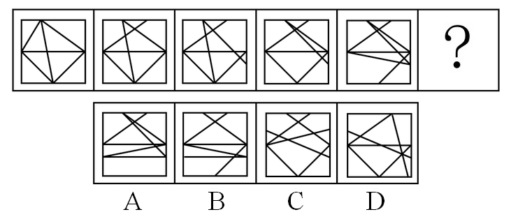 【解析】本题考查样式类。 观察题干图形,发现已知图形中的线条较多,因此首先考虑线和线之间的关系。图形均由10条直线组成,且选项也都是由10条直线组成,而对比图1和图2,发现只有一条直线位置发生变化,图2到图3、图3到图4、图4到图5同理,也只有一条直线位置发生变化,因此问号图形相对于图5,也应该只有一条直线位置发生变化。