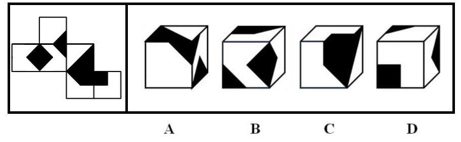 【解析】本题考查空间重构。 A项中,上面的带有大直角三角形的面和正面的公共边应为白色三角形的直角边,不是黑色三角形的直角边,排除; B项中,上面的梯形方向应该为