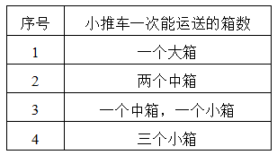 小陶要用小推车运送120本书到图书馆。已知大箱、中箱、小箱一次分别能装10、8、6本书,大箱、中箱、小箱各有3、4、13个。小推车一次能运送的箱数如下表。如果箱子不重复利用,小陶最少要运( )次,才能把所有书运送到图书馆。