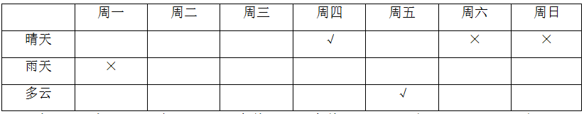 D项中,如果周二多云,由条件(5),周一和周三必然是晴天,可以推出。