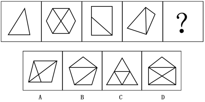 【解析】本题考查数量类。 元素组成不同,且无明显属性规律,优先考虑数量规律。 图形中面的特征较为明显,因此考虑数面,题干图形面数量依次为1、4、2、2、?,无规律; 图形均为直线组成,数直线,题干图形直线数量依次为3、8、5、5、?,无规律; 再观察发现,题干图形外框的直线数为3、6、4、4、?,观察数字发现,每个图形外框直线数与该图形面数量之差均为2。 因此“?”处也应选择一个外边框线条数量和面数量差为2的选项。 故本题答案为B选项。
