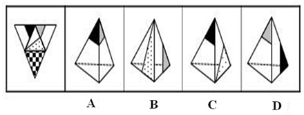 【解析】本题考查四面体和八面体。 A项中,黑色三角形的右边相邻面是灰色三角形,而题干中黑色三角形的右边相邻面为带有灰点的面,排除; B项中,如下图所示红色的两条边在折叠之后是公共边,而选项中灰色三角形与之公共边的面是带灰点的三角形的面,而不是黑白格子面,排除;
