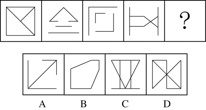 【解析】本题考查数量类和属性类。 题干图形组成混乱,但是可以发现其中所有图形均为轴对称图形,且其对称轴每次逆时针旋转45度,排除C、D两项; 由于图形均为直线图形,因此可以考查图形中的直线数量,题干图形的直线数量均为6,因此问号图形的直线数应该也是6,A、B两项的直线数分别为5、6,因此可以排除A项。 故本题答案为B选项。