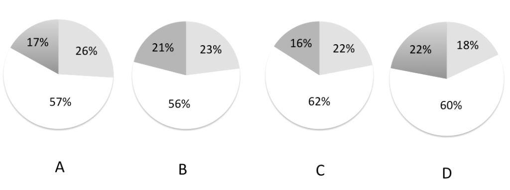 下列统计图中,( )最接近2012年1~7月份该市国有及国有控股企业、民营企业和外商控股企业完成增加值占全市规模以上工业增加值总量的比重构成。