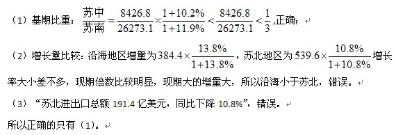 下列判断正确的有 (1)2012年1-9月,苏中地区生产总值不足苏南地区的三分之一 (2)2013年1-9月,江苏省沿海地区工业用电量同比增量大于苏北地区 (3)2013年1-9月,苏南、苏中、苏北的地区生产总值、规模以上工业增加值、工业用电完成固定资产投资和货物进出品总额同比均有所增长