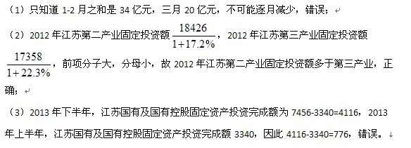 下列判断正确的有 (1)2013年第一季度,江苏第一产业固定资产投资额完成额逐月减少 (2)2012年江苏第二产业固定投资额完成多于第三产业 (3)2013年下半年,江苏国有及国有控股固定资产投资完成额比上半年多886亿元