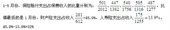 2013年1—5月,在保险业保险赔支出额与保险保费收入额的比值最低的月份中,财产险的保险赔付支出占保险保费收入的比重比人寿险的保险赔付支出占保险保费收入的比重:
