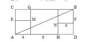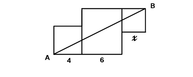 下图是由三个边长分别为4、6、x的正方形所组成的图形,直线AB将它分成面积相等的两部分,则x 的值是