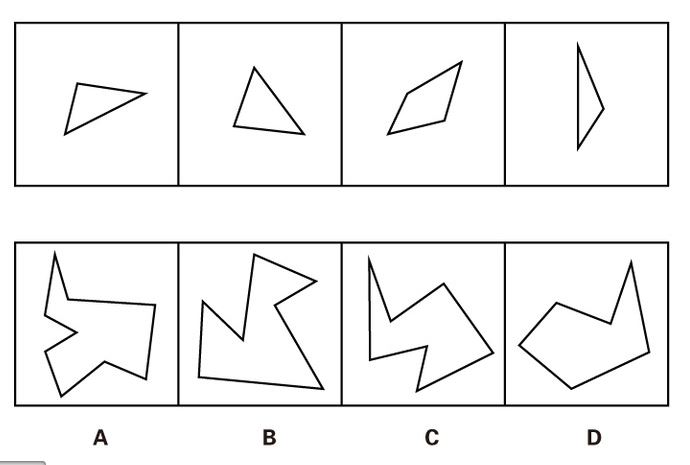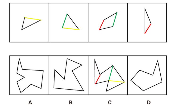 [2017增] A.图A B.图B C.图C D.图D 答案:C。 解析:本题考查的是平面拼合,可以采用平行等长消去的方式。消去平行等长的线段(相同颜色标注)后进行组合得到轮廓图,即为C选项。平行等长消去方式如下图所示: