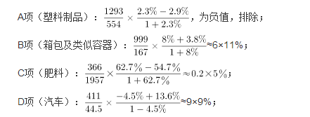 定位材料代入平均数的增长量计算公式可得,A、B、C、D四项商品的平均价格同比增长量约为: