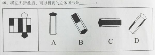 [2017增] A.如图A B.如图B C.如图C D.如图D 答案:C。 解析:空间重构类。平面图形中两个长方形白面没有相邻,排除A;两个长方形白面中间夹的是黑色面,排除B。D长方形白面的左右面和题干图形不符,排除D。所以正确答案为C。[2016年上海《行测》真题]">