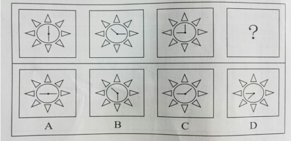[2017增] A.如图A B.如图B C.如图C D.如图D 答案:D。 解析:位置类。解法一:上方竖线依次逆时针旋转45度,下方竖线依次逆时针旋转90度。解法二:两条竖线构成的夹角度数分别为180度、135度、90度,接下来应该是夹角45度。本题答案为D选项。[2016年上海《行测》真题]">