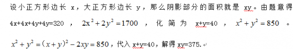 下图中间阴影部分为长方形。它的四周是四个正方形,这四个正方形的周长和是320厘米,面积和是1700,则阴影部分的面积是( )平方厘米。