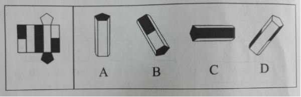 空间重构类。平面图形中两个长方形白面没有相邻,排除A;两个长方形白面中间夹的是黑色面,排除B。D长方形白面的左右面和题干图形不符,排除D。所以正确答案为C。[2016年上海《行测》真题]