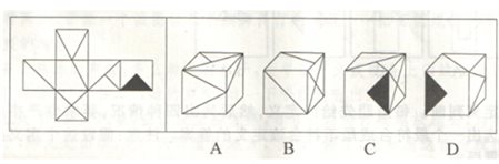 A.如上图所示A B.如上图所示B C.如上图所示C D.如上图所示D 答案:A。 解析:本题考查空间重构。B项中三个面的公共点引出的对角线在原图中为两条,而B项中只有1条,故排除;C与D时针方向与原图不一致。故答案选A">