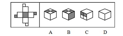 A.A B.B C.C D.D 答案:A。 解析:题干中给出的是一个平面展开图,我们可以发现含有2个小阴影方块的面和全阴影的面属于一对相对面。相对面的特性是在立体的侧视图中能且只能看到一个面。B项2个面都出现了,排除,D项2个面都没有出现,排除。而2个小方块的阴影面处在对角线上,不相邻,所以排除C。因此,本题答案为A选项。">