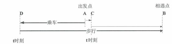 如图所示,设小明在A点看到姐姐后在D点下车,此时姐姐走到了C点。然后小明追姐姐。