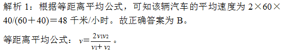 解析2:假设AB两地的距离为240千米,则该汽车往返的时间分别为240÷60=4小时、240÷40=6小时,故汽车行驶的平均速度为(240×2)÷(4+6)=48千米/小时。故正确答案为B。
