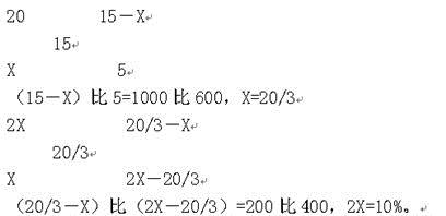 瓶中装有浓度为20%的酒精溶液1000克,现在又分别倒入200克和400克的A、B两种洒精溶液,瓶里的溶液浓度变为15%,已知A种酒精溶液的浓度是B种酒精溶液浓度的2倍。那么A种酒精溶液的浓度是多少? ( )
