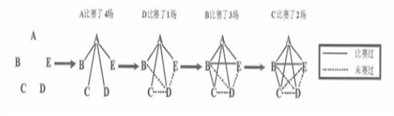 (2008江西,第43题) A、B、C、D、E这5个小组开展扑克牌比赛,每两个小组间都要比赛一场,到现在为止,A组已经比赛了4场,B组已经比赛了3场,C组已经比赛了2场,D组已经比赛了1场,问E组比赛了几场?( )