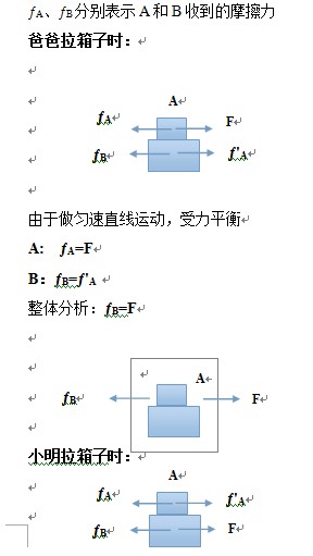 如图所示, A、B两个箱子叠放在一起,爸爸和小明分别用大小为F的恒力用力拉,使两个箱子沿水平做匀速直线运动:爸爸个子高,着力点在A箱子上,小明个子矮,着力点在B箱。下列说法中,正确的是( )。