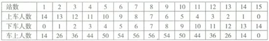 根据题意,从第1站到第15站,每站上车人数应该分别为14、13、12、11、…、2、1、0人,每站下车人数应该分别为0、1、2、3、…、12、13、14。