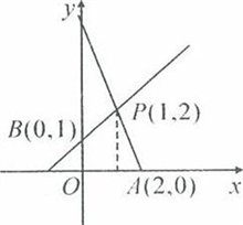 相交于P(1,2),且分别与x轴、y轴交于点A、B。则四边形OAPB的面积是: