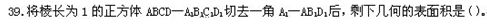答案:C。 解析:要求的是表面积,正方体在切去一个角以后边成了一个七面体,其有有三个面仍是原来的正方体的正方形,边长为1,面积是1,合计面积为3,另外四个面中有三个面是原正方形的一半,合计面积为