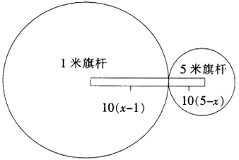 旗杆的高度最高为5,最小为1。因此这两个旗杆间的距离不超过(5-1)×l0=40米。考虑其余旗杆的位置分布,设任意旗杆高度为X,要满足与1米旗杆间距离不超过它们高度差的10倍,应在下图左边的圆范围内。要满足与5米旗杆间距离不超过它们高度差的10倍,应在下图右边的圆范围内。同时满足条件的旗杆只能位于两个旗杆的连线上。所以满足条件的旗杆都位于一条直线上,最少需要40×2=80米即可把它们都围进去。