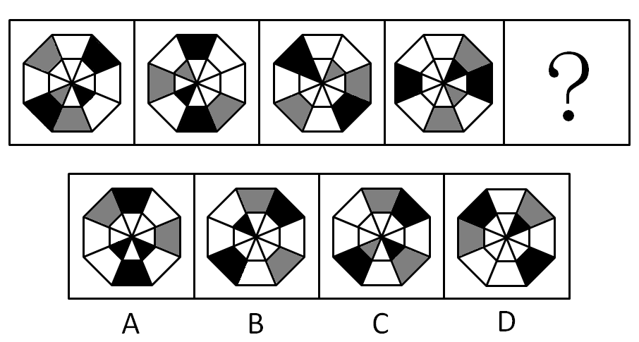 【解析】此题考的是位置平移的规律,全黑的梯形逆时针平移1格,据此可以排除A和D两个选项。全黑的三角形顺时针平移2格可以确定C选项为正确选项。