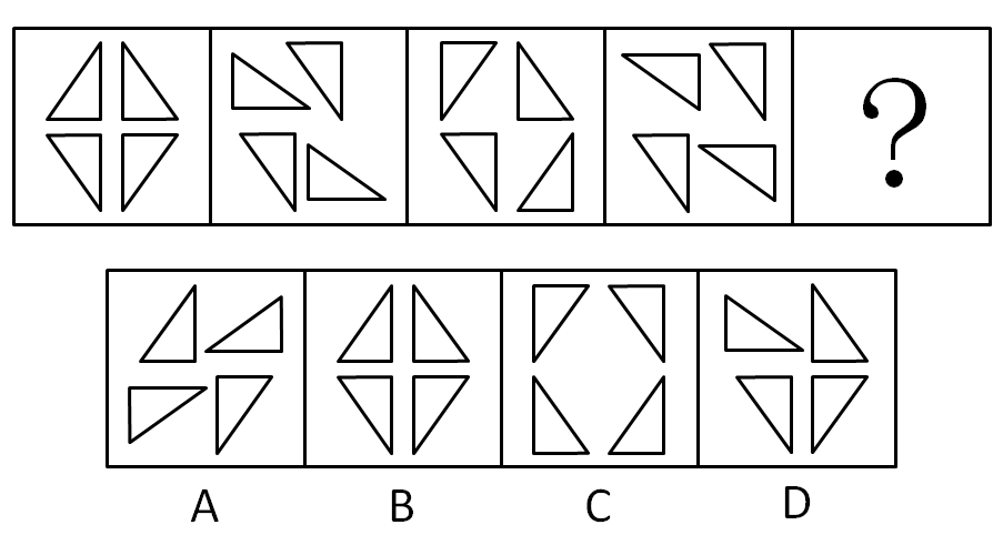 【解析】此题考察的是位置旋转的规律,左上角的三角形顺时针旋转90度,右上角的三角形旋转180度,左下角的三角形不变,右下角的逆时针旋转90度,因此正确答案为B选项。">