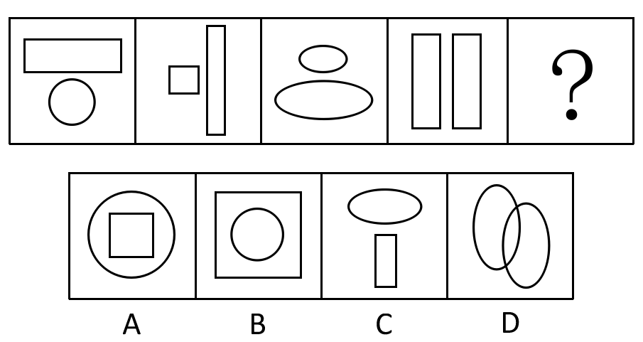【解析】本题考查位置类问题中的静态位置问题。观察图形发现四幅图均由两个元素构成,两个元素是相对独立的且两元素位置关系依次是上下、左右、上下、左右的关系,选项当中两元素独立且位置关系是上下的只有C选项。因此,本题答案为C选项。