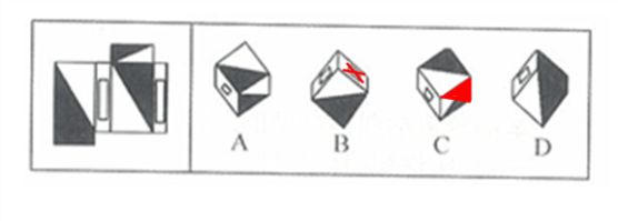 这道题属于结构类,主要考察图形的折叠。根据平面图形中相对的两个面折叠后不可能相邻的原则,两个大长方形的面、两个含有小白矩形的面是对面,不可能相部,首先排除B。A中右侧面阴影三角形的方向错误.如果C中右侧面是阴影三角形的话,方向是错误的,或者右侧面应是全黑色。故正确答案为D。