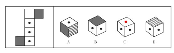 这道题属于结构类,主要考察立体图形的折叠。从纸板可以看出,两个阴影正方形的位置只能是相对的,所以A、C、D可以排除。