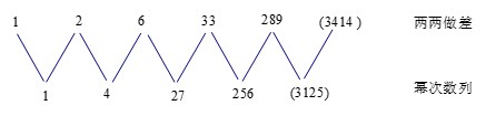 如下图所示,两两做差后可得到1、4、27、256,这是幂次数列,分别为