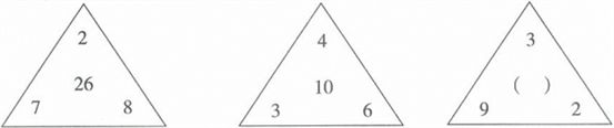 三角形下面两数之和减顶部数之差的2倍构成中间的数,即(7+8-2)×2=26,(3+6-4)×2=10,(9+2-3)×2=16,故选C。