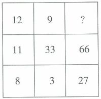 A.35 B.40 C.45 D.50 答案:C。 解析:每一行数中,第一个数的3倍与第二个数之和构成第三个数,即11×3+33=66,8×3+3=27,可见问号处是12×3+9=45,故选C。">