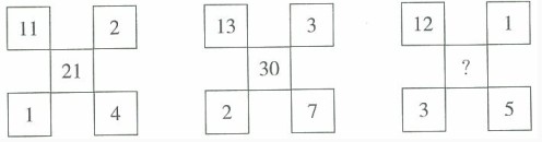 A.34 B.32 C.24 D.28 答案:D。 解析:经过对第一、第二个图形的观察,可以发现,第一组图形的规律为:(1+2)×(11-4)=21,第二组图形规律为(2+3)×(13-7)=30,第三组图形也应当符合这一规律为(3+1)×(12-5)=28,所以答案为D项。">