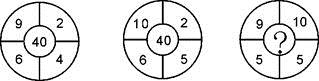 A.40 B.60 C.110 D.210 答案:B。 解析:3个圆圈中都有奇数个奇数,仅通过加法一般无法得到结果。又因为两个中心数字都很容易分解,所以考虑先加减后乘除。(9-4)×(6+2)=40,(10-5)×(6+2)=40,(9-5)×(10+5)=60。因此,本题答案为B选项。">