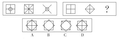 A.A B.B C.C D.D 答案:B。 解析:在第一组图形中,前两个图形去同存异得到第三个图形;第二组图形中,前两个图形去同存异得到B项。因此,本题答案为B选项。">