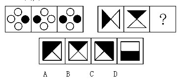 A.A B.B C.C D.D 答案:A。 解析:本题属于黑白叠加类图形推理。第一段图形中第一个图形和第二个图形颜色黑白叠加。黑色与其他颜色叠加都等于黑色,白色与白色叠加等于白色。第二段图形中,黑色与没有颜色的地方,以及没有白色的地方相叠加都等于黑色。故选A。">
