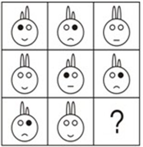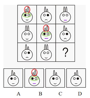 这道题属于数量类,主要考察图形一共有几种元素。通过比较看眼应该是缺一个左黑右白的,排除D,嘴应该是平的,排除C,耳朵应该左短右长,所以选择B